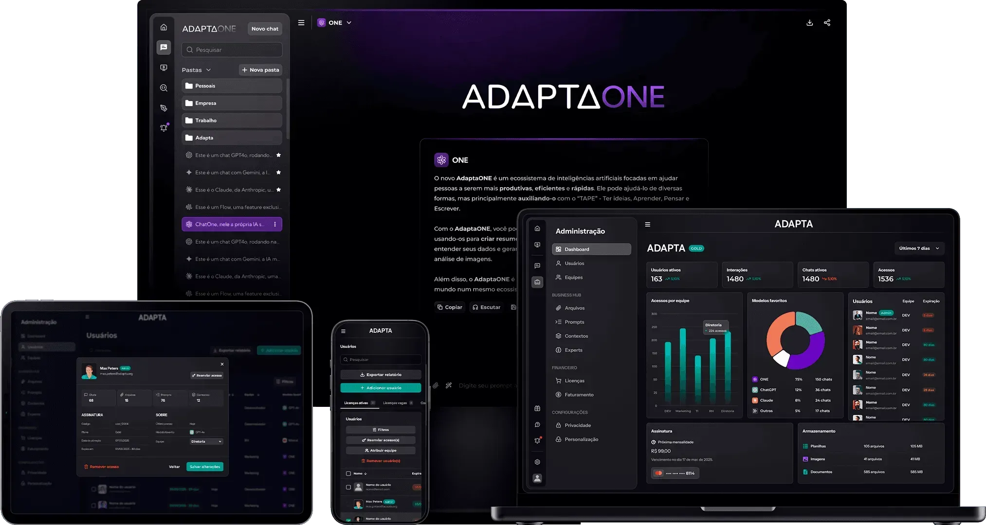 Com o Adapta ONE BUSINESS, sua equipe tem acesso às IAs mais poderosas do mercado otimizadas para uso profissional e prontas para rodar em máxima performance.